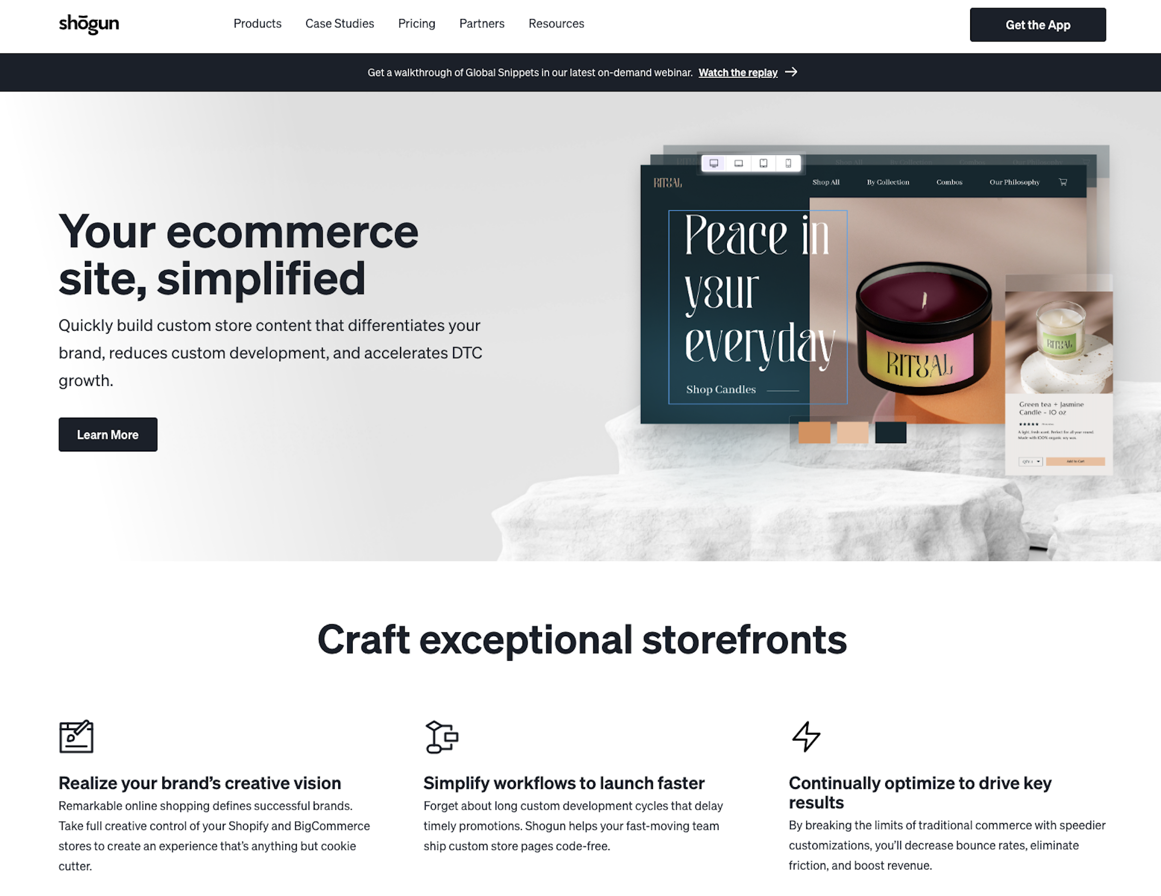 The Shogun homepage from Spring 2023. It got a whole rewrite and redesign, so Content and Design worked together with executive stakeholders to refresh the voice and look of the brand, with a focus on Page Builder.
